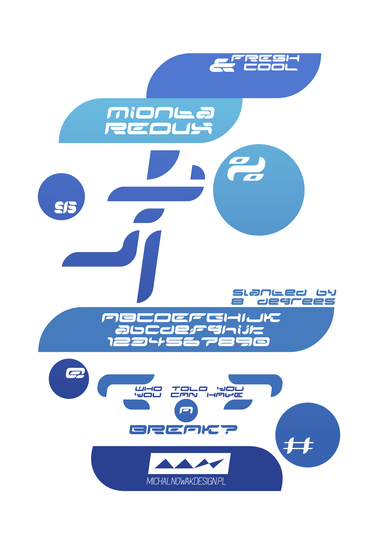 After so many years, thanks to the amazing nudge feature it's been finally possible for me to recreate Mionta, my 2010 SportsComp entry, the way it should be. No awkward faux-Bézier this time around! It was very fun and a bit challenging to arrange all the bricks together so that they form 16 times smaller versions of the original characters. I did alter some letters and characters however. The ampersand was especially ugly in the original version. I also changed the look of the period (as well as the dots in colon and semicolon respectively). The positioning of left and right quotation marks was my conscious choice, it's a bit more aesthetically appealing to me that way. Double quotation marks are also sort of more ornamental and can serve a purely decorative purpose (this is also why "<" and ">" look the way they look - similar idea). And the percent sign, I love it so much that I think I'm going to marry it. Due to FontStruct's limitations, diagonal lines in K and N couldn't be preserved. Also, tracking isn't as tight, because we can't go below -1, but I think it's a good thing in this case. Just like before - make sure to try out fake italics! More fonts to come in very near future. Changelog: - minor corrections - & was still a little bit off - bar in lowercase t is now a bit raised ^and that renders the sample picture outdated, fantastic.