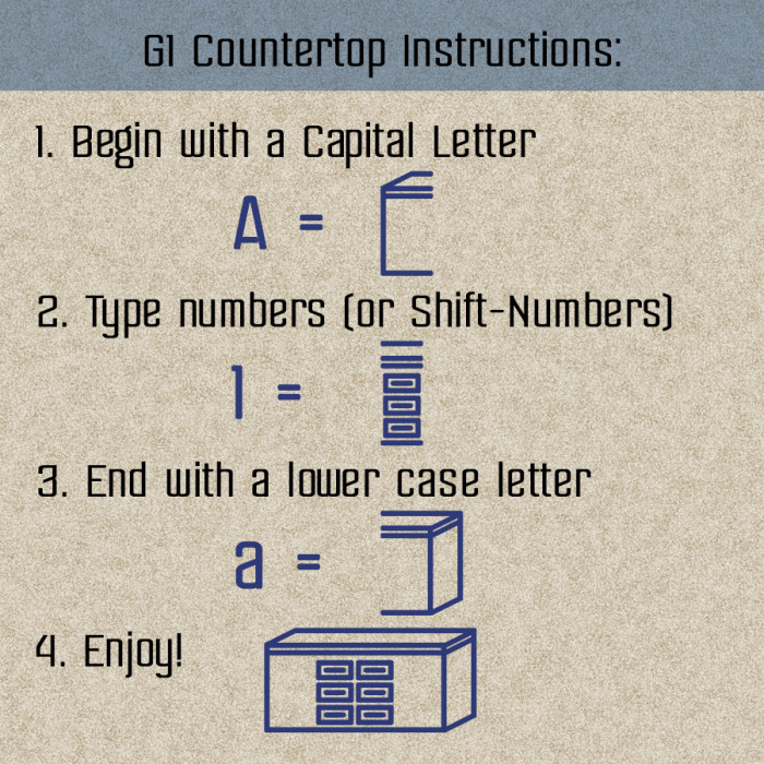 Completed countertops can contain at least two pieces: an uppercase and lowercase letter. The left side of the counter starts with a capital letter, which has a corresponding right side piece in the same lower case letter. Numbers and Shifted Numbers contain center pieces that can be typed in multiples.
