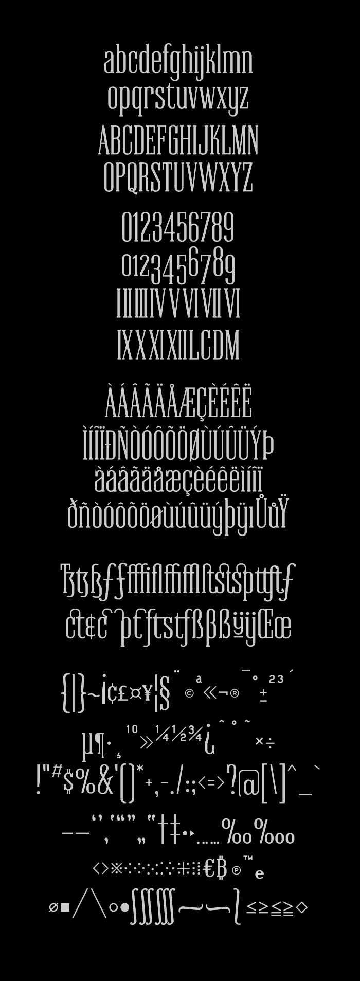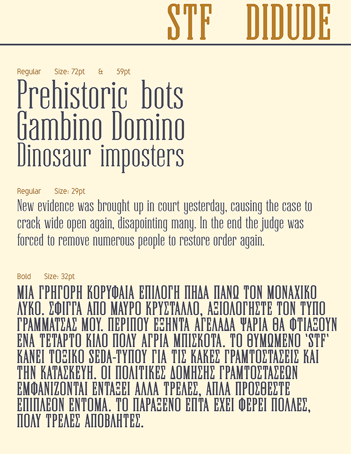 Certain features that were implemented into DIDUDE's design are somewhat setting it apart from most other, more traditional typefaces in this genre, and most notable is the more relaxed contrast ratio that was choosen for this particular project.