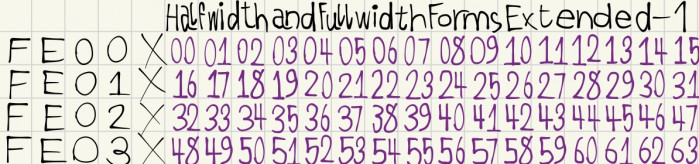 @xXFarmItFan330Xx I've also been planning a Halfwidth and Fullwidth Extensions block, and I'd like to share my thoughts so we can collaborate. I'm planning on including halfwidth archaic Katakana and Hangul jamo, Bopomofo, certain important CJK ideographs, and Minecraftian. I don't think the fullwidth double numbers you put in FE000..FE064 serve any purpose, as they would be identical to a sequence of two (halfwidth) numbers. Also, the entire FExxx region has already been claimed by me and mostly filled, so it'd have to be moved somewhere else.