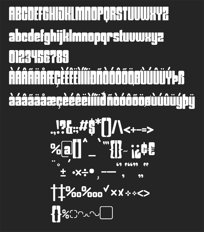 The designer of this FontStruction has chosen not to make it available for download from this website by choosing an “All Rights Reserved" license.
