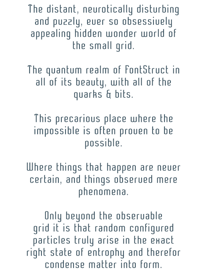This is the 'Therapy'-style in the 'ELEGANZA' typeface family. This version basically aims for the exact opposite effect than what the Tight' version did. The name 'Therapy' relates to its 'opened-up' appearence and the overall de-stressed propperties of this version. The more relaxed and spacious distribution remotely resembles the characteristic feel of a typewriter face. But the main purpose for this version is to create visual hierarchy in your layout.