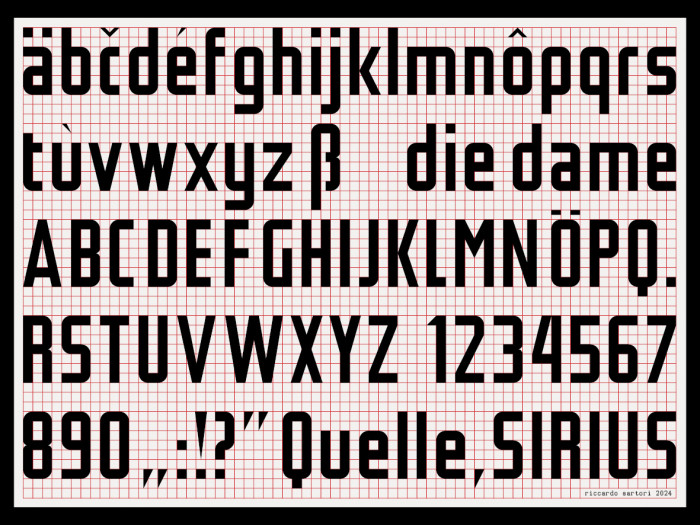 In expanding the glyph coverage, I tried to remain true to the spirit of the original self imposed limitations, both in terms of grid (e.g. the cramped space for the uppercase diacritics), and of tools (see the solution for superscripts et similia).