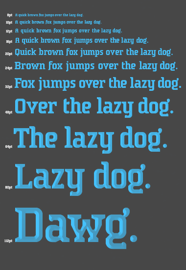 Check out the Gallery view zoomed exactly one notch above the “pxl” size to test drive iSlab with very sharp and sturdy pixel rendering. The two-brick stroke thickness (same as 16pt sample above) reveals the fontstruction’s use of 2x2 scaled bricks. Yet underneath these 2x2 bricks is a grid half the size. Put another way, the 8pt sample, a smaller sharp pixel rendition, has an x-height of only four pixels. The serifs melt with buttery goodness into the letter spaces at this scale by literally becoming them.