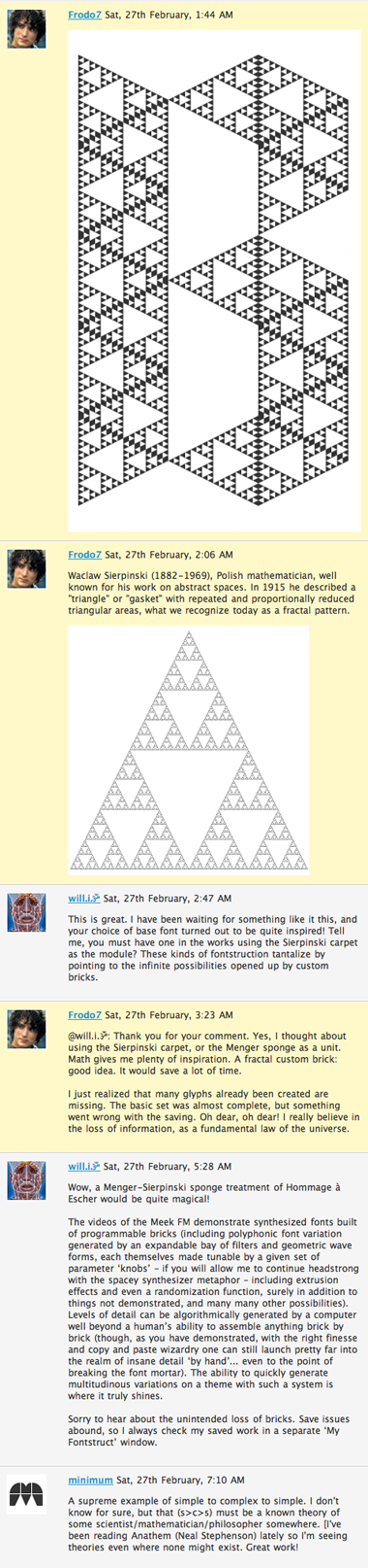 I've seen the videos on Meek FM on Vimeo, and more. The synthesizer captured my imagination too. Endless possibilities, and the hardware is not even necessary. But I wondered if we've got this magic wand for generating new fonts, how would it affect the creative process. Would it be detrimental to creativity, since one can generate almost perfect fonts by pushing some buttons or turning some knobs. My answer is yes, and no. To some extent, and for some people it would be the equivalent of ready-made food in culinary terms compared to the haute cuisine of FontLab and other serious tools. But for a small group of clever artists it would be a new instrument to play with, a new challenge to explore the possibilities, to take it to the limits, and hopefully create something new and extraordinary, not possible with traditional tools.