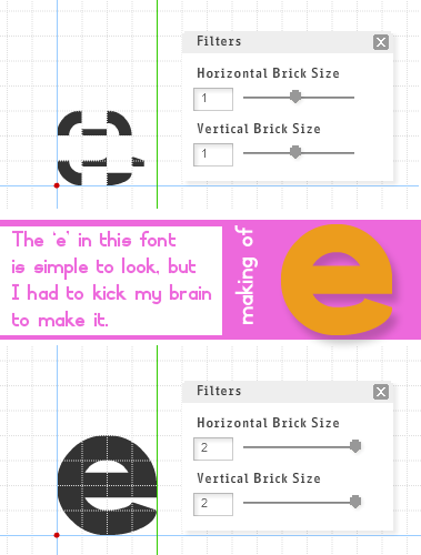 "zkandia eYe/FS". Those were simply good looking. I could find some similarities between "en sans" and those. But it seems I had taken a difficult route to make this. I wanted to make a totally circular 'o'. So I made use of the four macaroni bricks. When it came to fonstruction of 'c', I had to make use of compositions to make its right half look circular. It was like solving a puzzle. I used the same idea for e and s. Also I tried my best to create uniform thickness (even at different angles). At last I am happy for making this one.