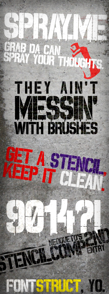 Spray.ME is a classic stencil typeface, a bit inspired by Impact, but with a little twist. Hold Shift while typing for a dirty effect of fresh paint dripping from the letters. Stains, splatters - just like it was sprayed a few seconds ago. "!" hides behind "\" and "|".