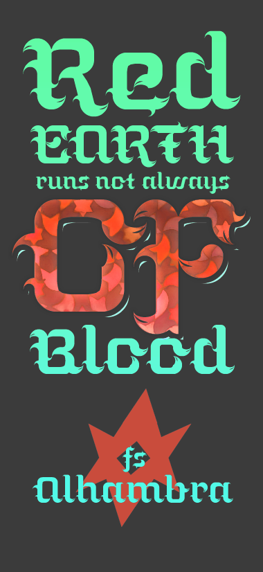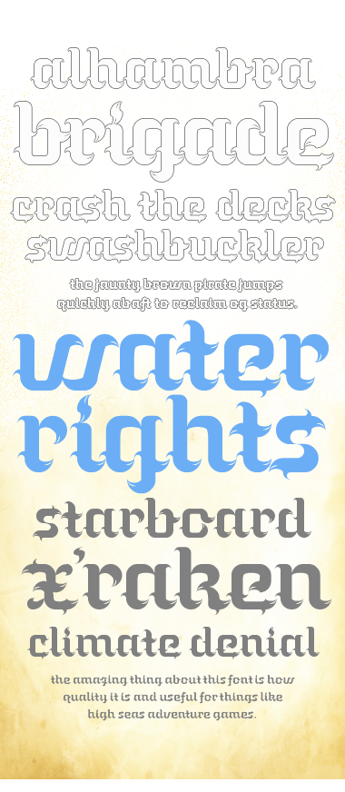 I named this fontstruction after Calat Alhambra from early on while pursuing a much more Arabic flavored script. The style began to blend with blackletter motifs and then took on a fat, round brush texture. The “pirate” theme emerged. Actually, that all sounds pretty Moorish to me.