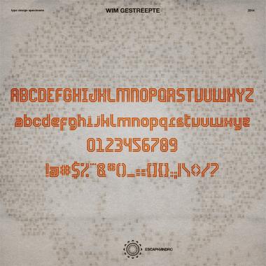 Inspired bt the works of great Wim Crouwel and striped sports jerseys. Also a study in 45 degrees diagonals, happily provided by fontstructor and master Goatmeal. Basic latin support and a few ligatures. **UPDATE 19.11.2014 I worked out a few unbalanced characters and added ligatures. Hope you like it!