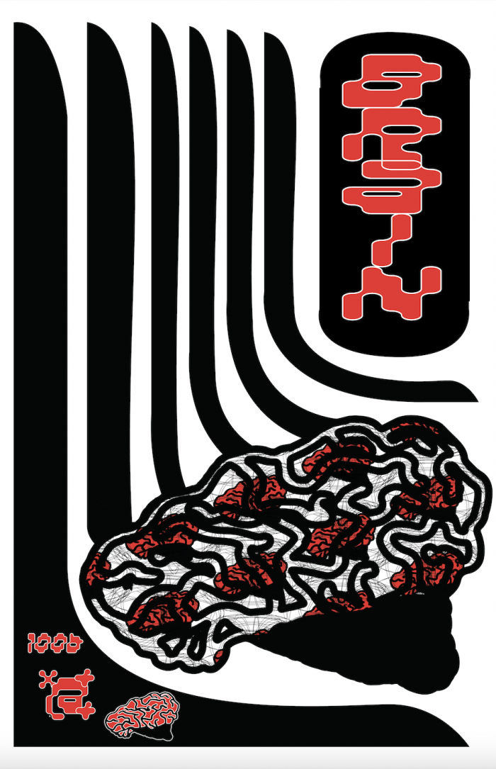 This is a fine example of "glitch typography" - as far as I can read it - a trendy style based on mimicking the image artefacts of old CRT monitors. Great application of the standard brick palette, and fitting retro-futuristic demo pics. 10/10
