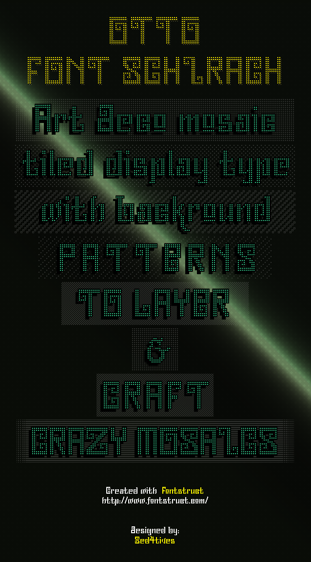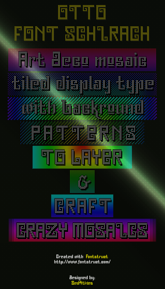 It's designed to craft layers of typographic mosaics. It can create very subtle clear display text combinations when only layering text with just one or two backgrounds max. This will result in nice retro-ish mosaic typography. But beware, combining two or more background patters with for example different blending modes on each layer, this seemingly peaceful boy becomes capable of recreating the big bang!
