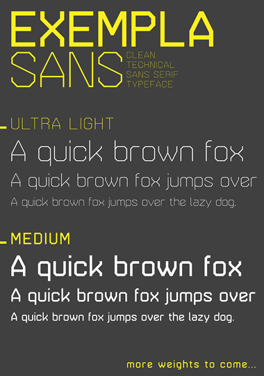 @cayo: Muchas gracias... El sampler fue hecho en algunos minutos. De veces es increíble como una fuente cambia de impacto simplemente con una combinación de colores diferentes. En negro y blanco casi es aburrido, y en amarillo y gris ya parece supercool... And I love familystructing too. Just a shame it's so much work to raise one. I guess every fontfamily-father would confirm that. ;)