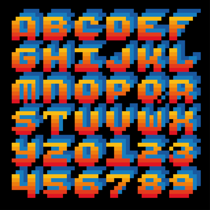 Third font in a series of three colour pixel experiments, made after reading Arcade Game Typography: The Art of Pixel Type by Toshi Omagari. This one has a double shadow, which gives an extruded 3D effect at a smaller scale.