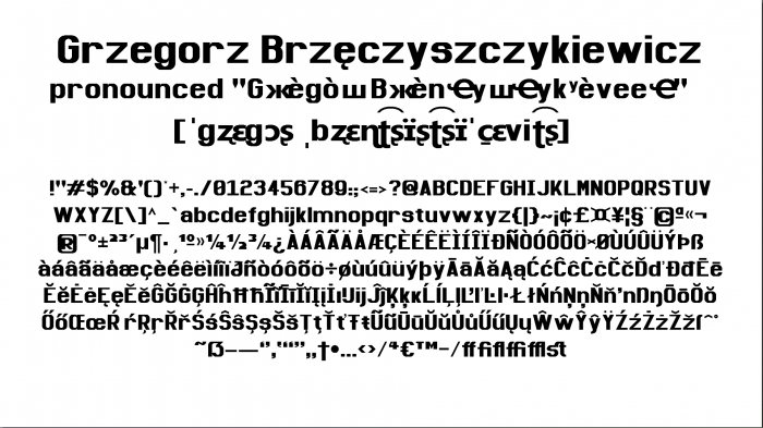 Tip on how to pronounce the name of this font: You first have to know the pronunciation of Polish words: The most important part is don't use a Russian accent.