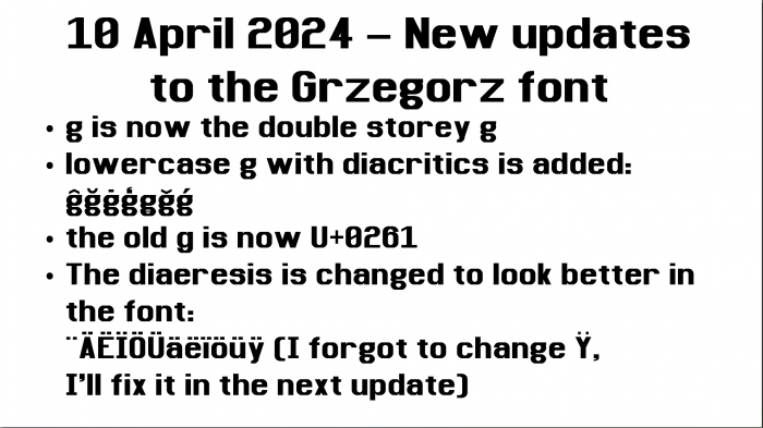 This is the font. The lowercase forms of g with diacritics in Latin Extended-A will be made after I make IPA extensions because I first need to change the main form of the g to double storey so that the script g in IPA extensions will be distinct in this font.