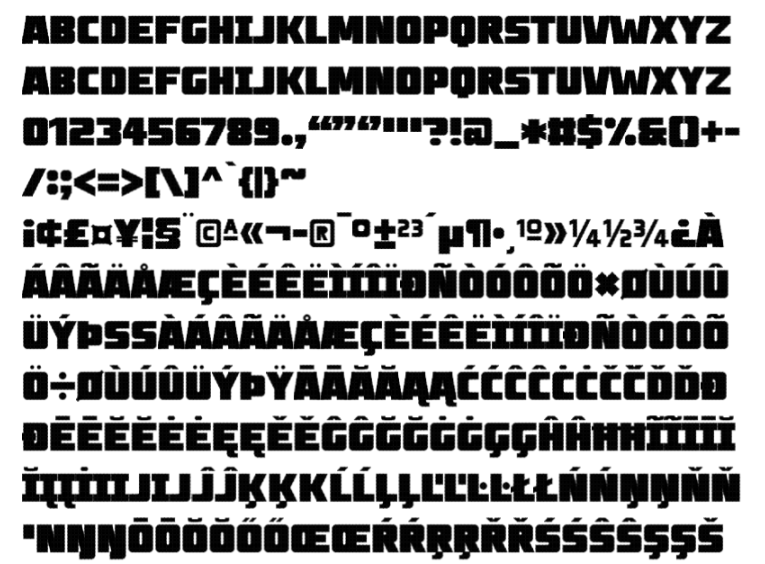 PW-Blacker Grotesk — a heavy geometric sans-serif font with robust language support. Capital-only.