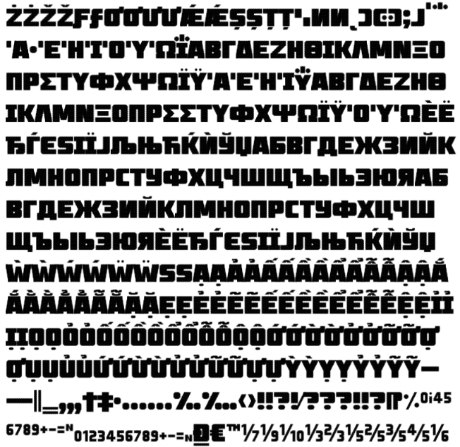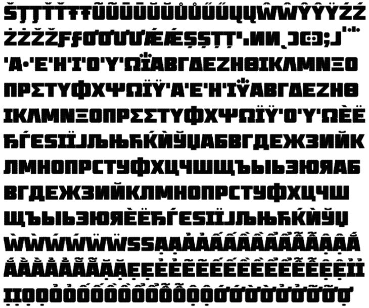 A heavy sans-serif all-caps font, with robust language support; quite a big endeavour. I have several suggestions for improving this work.