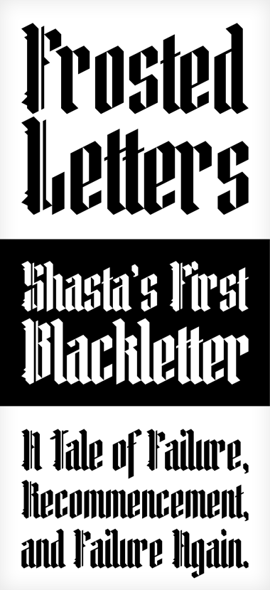 What I like about your design is the modernist of it, A Black Letter is comming out from and old Era (from 12th to 17th), and Frostletter is very "contemporain", so you have this marvelous mix in it. Bravo again!