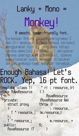 It's a lanky monospaced font: Monkey! Tall, sturdy, and 6 px wide (14 px line-height), most things work here, and it should be usable for programmers. Making diagonals appear to have a consistent width was tricky, so some of the letters look a little weird (lower-case z, upper-case K...), but in my opinion it isn't enough to hamper readability. This fontstruction uses a 2x2 filter and composite bricks, and it was fun to make.